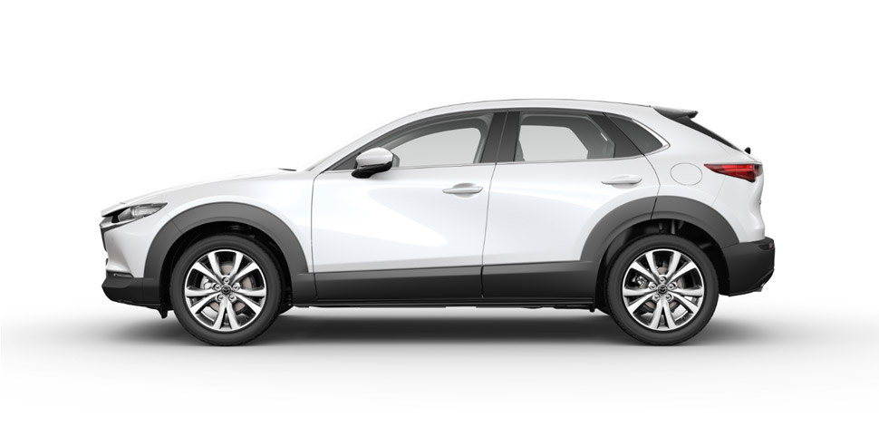 Ukuran dimensi tersebut membuat Mazda CX-30 tampak samping terlihat compact. Aura SUV terpancar dari warna hitam yang mengeliling mobil mulai dari bumper depan menyambung ke fender hingga belakang. Lekukan pada fender membuatnya terlihat berotot sehingga kuat akan aura SUV. Kemewahan coba dipancarkan melalui lis krom yang dimulai dari ujung jendela depan hingga ke pilar D.